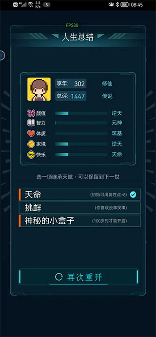 《人生重開模擬器天命之子版》是一款讓你能夠不斷輪回體驗人生的手機游戲,主要玩法為點擊和選擇。這意味著你只需通過觸摸和選擇即可進行游戲。玩家可以從出生時就開始設定自己的各種屬性,如體力、性別、性格、家庭背景等。在不同的年齡階段,玩家還會面臨各種人生考驗與選擇,從而按照個人喜好發展,并體驗不同結局的趣味人生。這款游戲非常真實地模擬了從出生到結婚生子過程中會遇到的一系列問題,十分有趣。同時,它也能真實反映出現代社會的現狀,你的選擇將決定你的人生軌跡如何發展,比如是選擇讀書還是打工,是選擇丁克還是生育兩個孩子等問題,都將影響你未來的生活方式。盡管這是一款文字類游戲,但游戲中包含了許多豐富的彩蛋,對于喜歡文字游戲的玩家來說不容錯過。即使是未曾接觸過文字游戲的朋友也非常推薦嘗試。