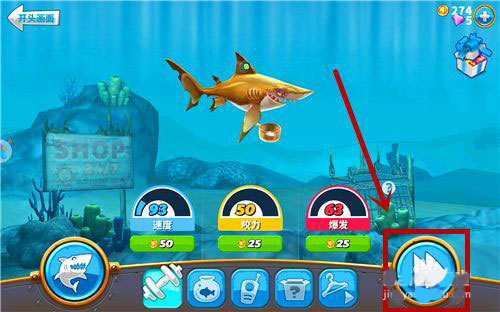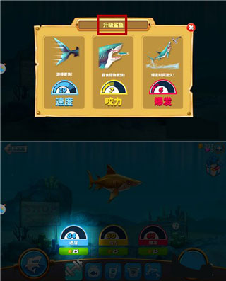4、升級鯊魚,相當于升級它的能力,升級需要里面的金幣,金幣可以通過吃吃吃獲得。
